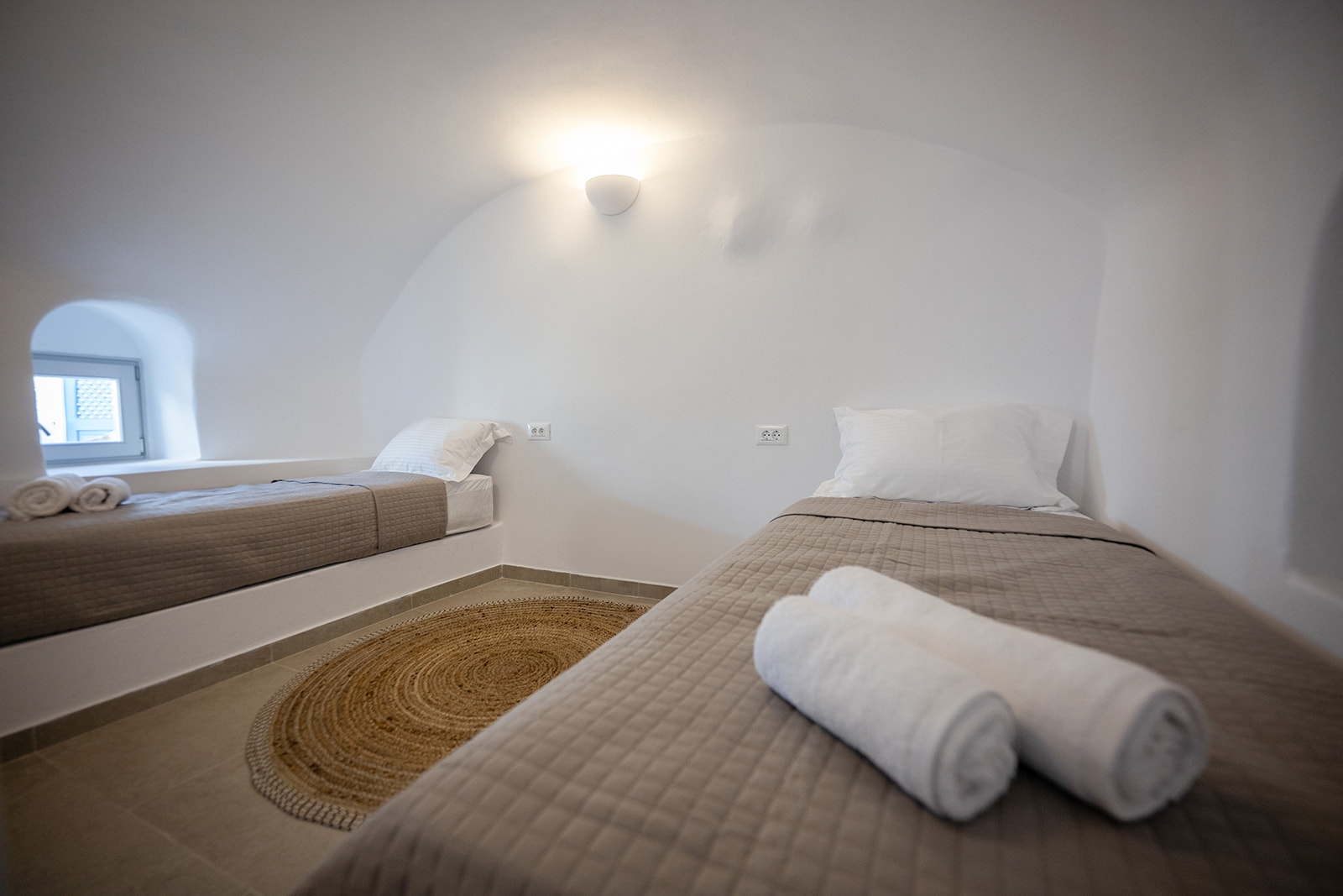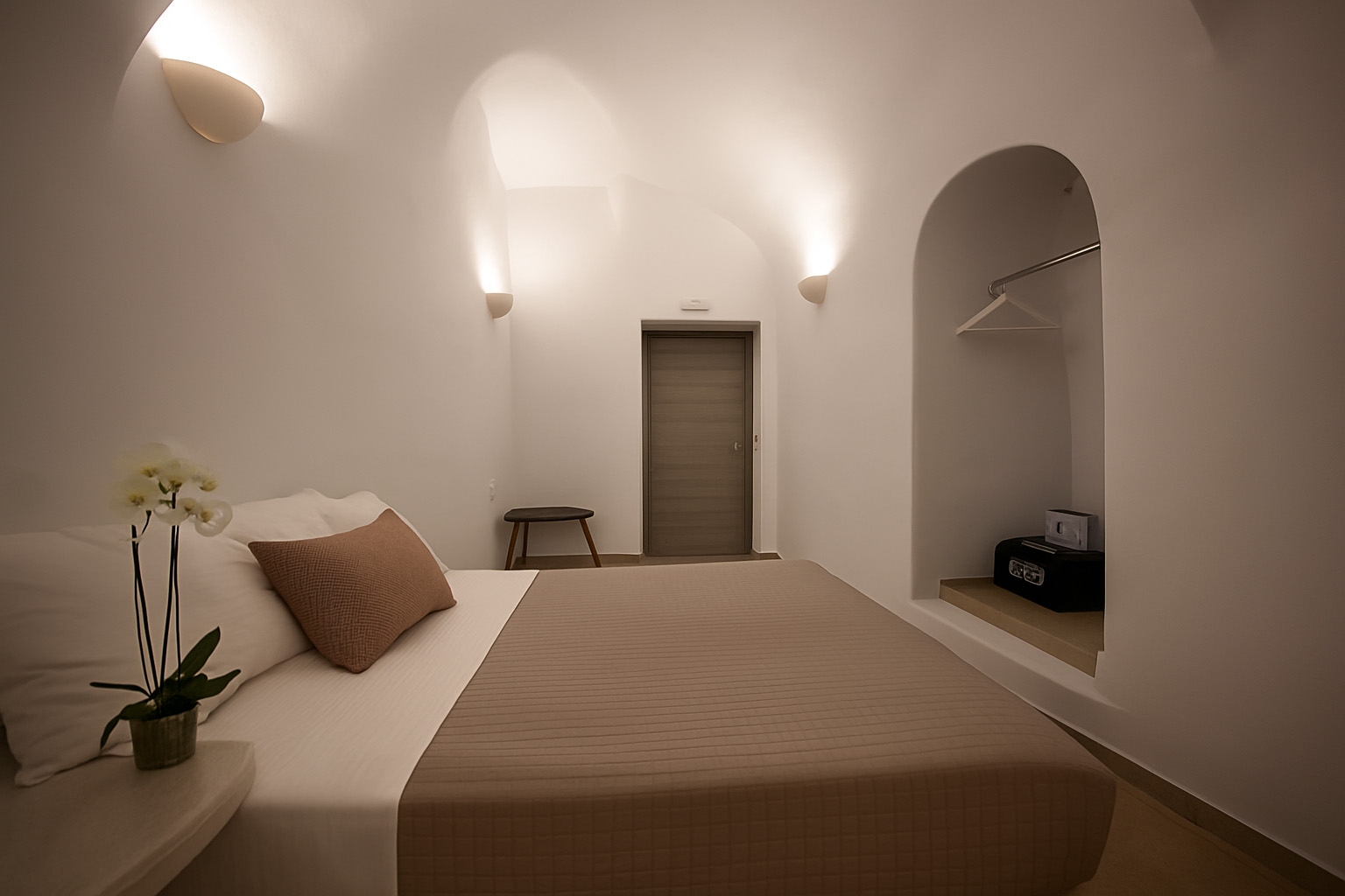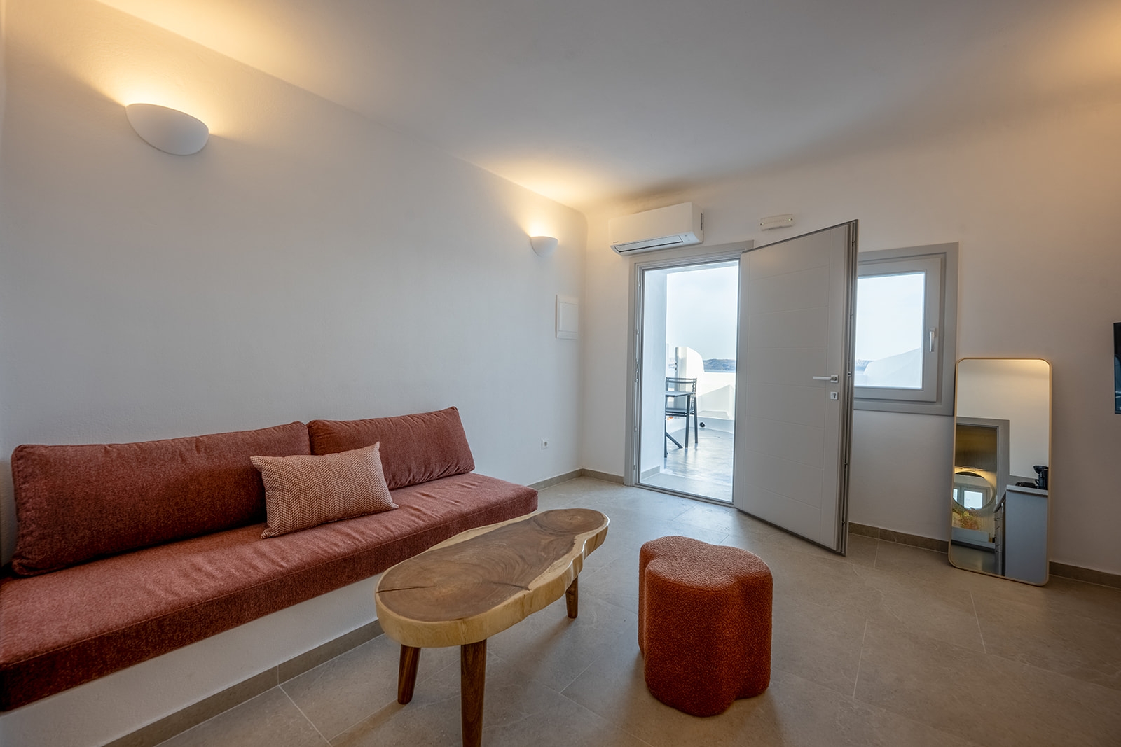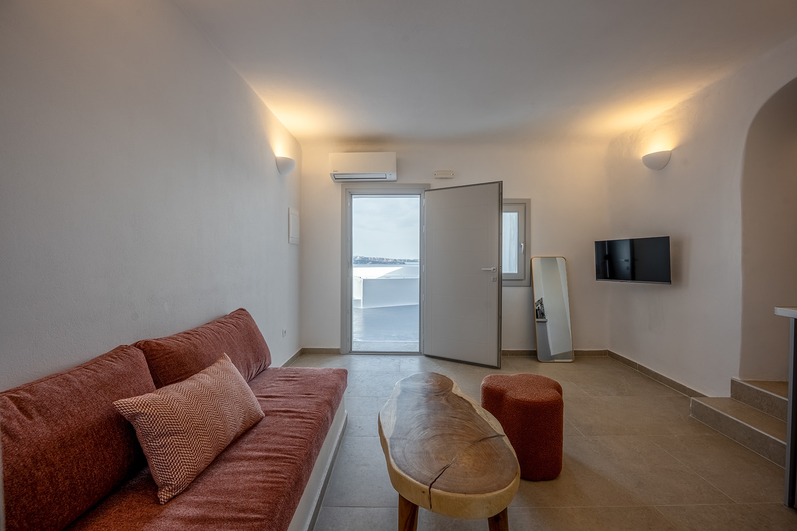 With a private entrance, air conditioning, soundproof walls, and a flat-screen TV, this villa blends traditional Cycladic charm with modern amenities for a relaxed yet refined Santorini experience.