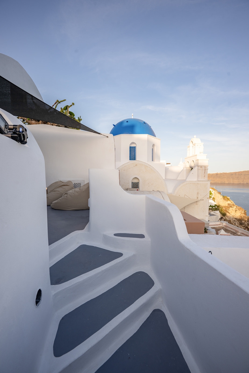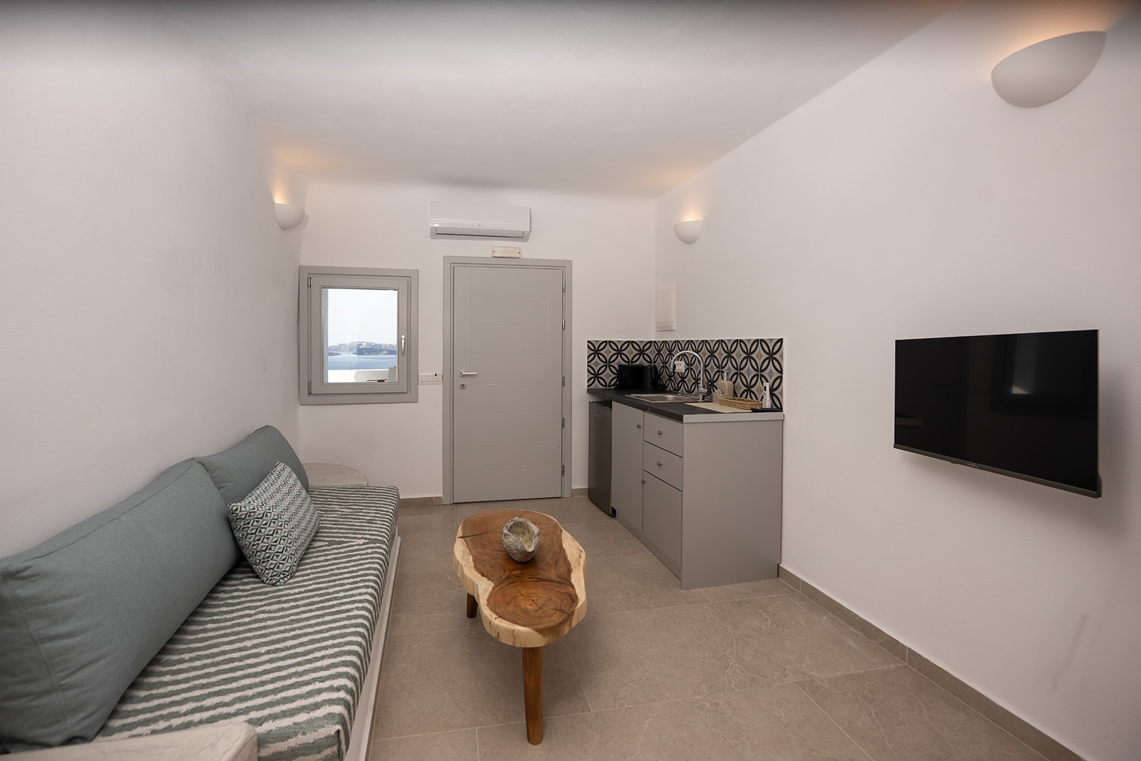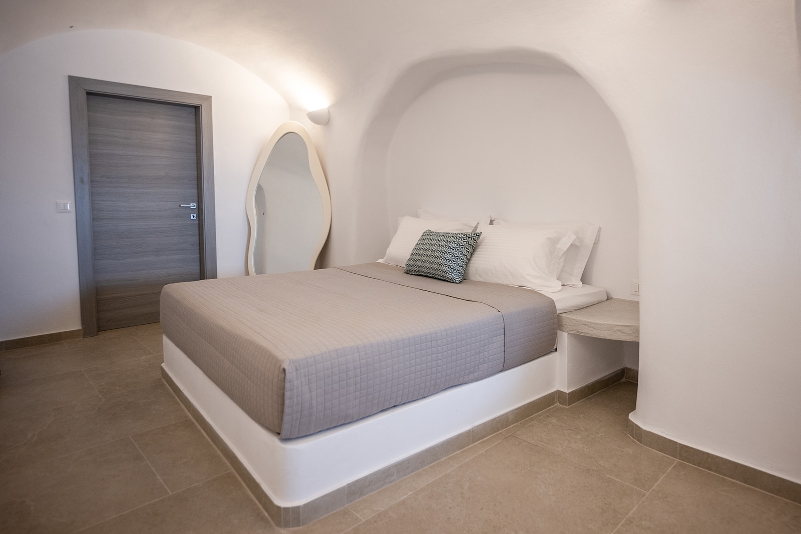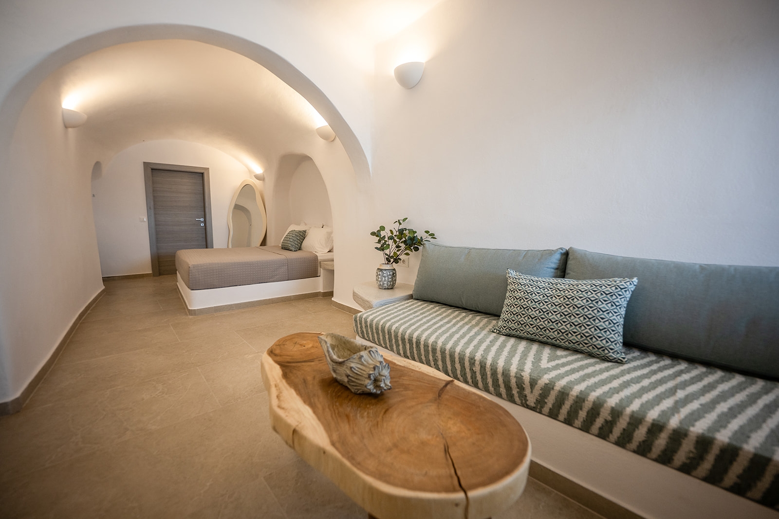 The suite offers two beds and blends traditional Cycladic charm with modern amenities—perfect for a memorable escape in Oia.