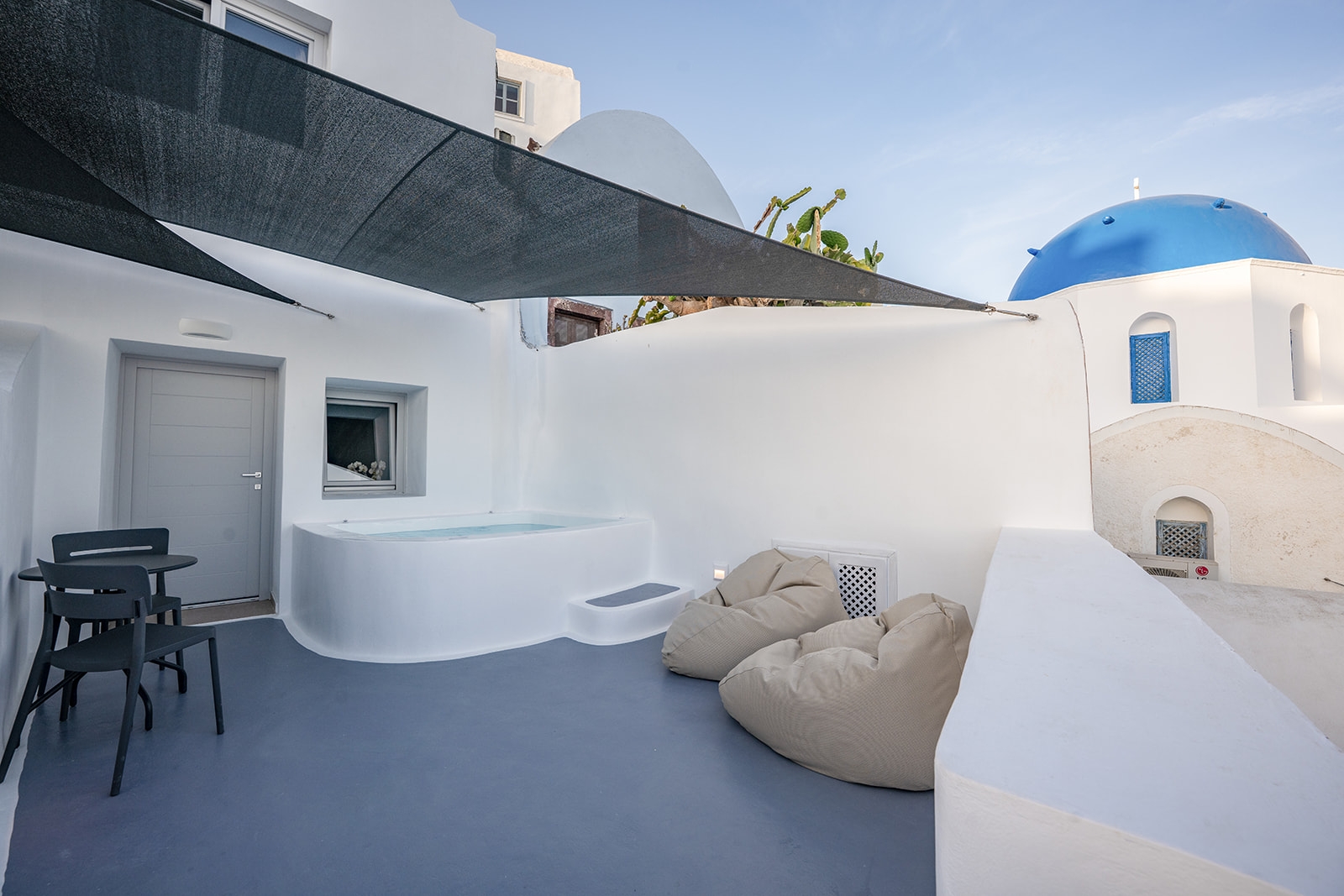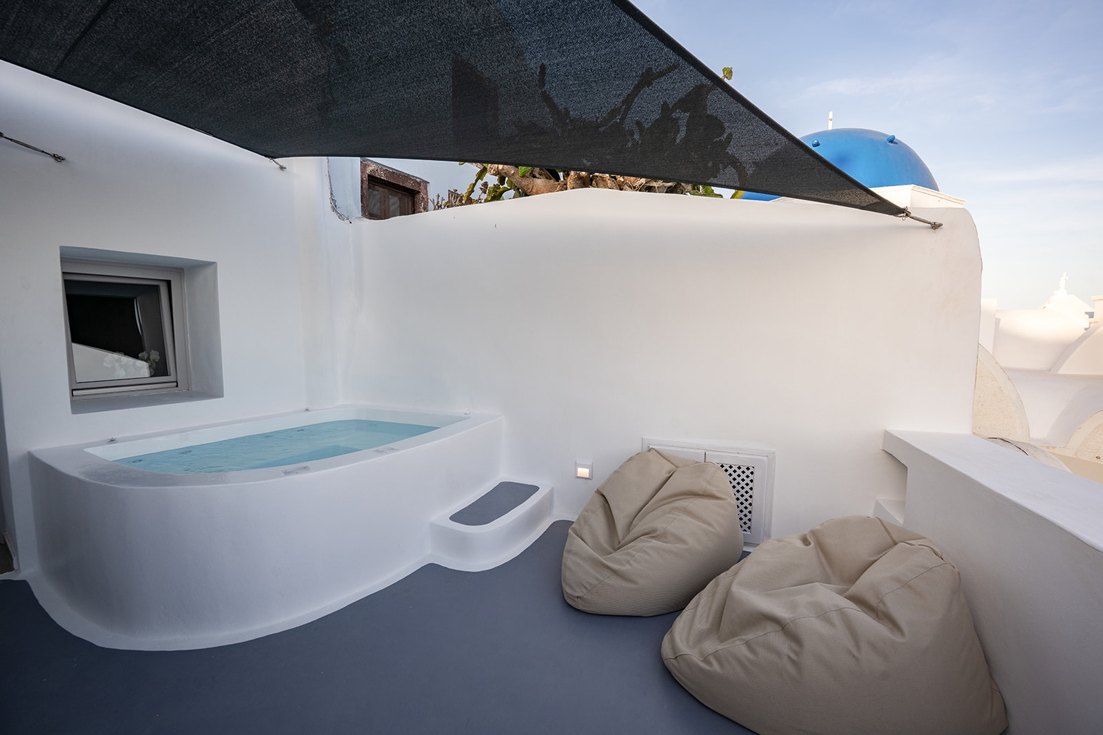 Enjoy breathtaking views of the caldera from your private balcony or unwind in your outdoor hot tub under the Santorini sun.